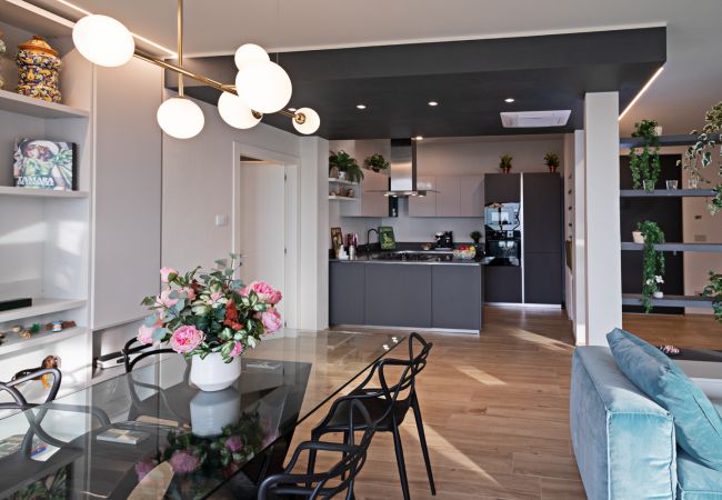 The entrance opens onto the main living room, with a decorative stone fireplace (not usable), three comfortable sofas, a satellite TV and a small library that ensure relaxation moments for the whole family. The adjacent dining area, furnished with a solid wood table and 8 seats, offers a panoramic view of the porch and Lake Garda.