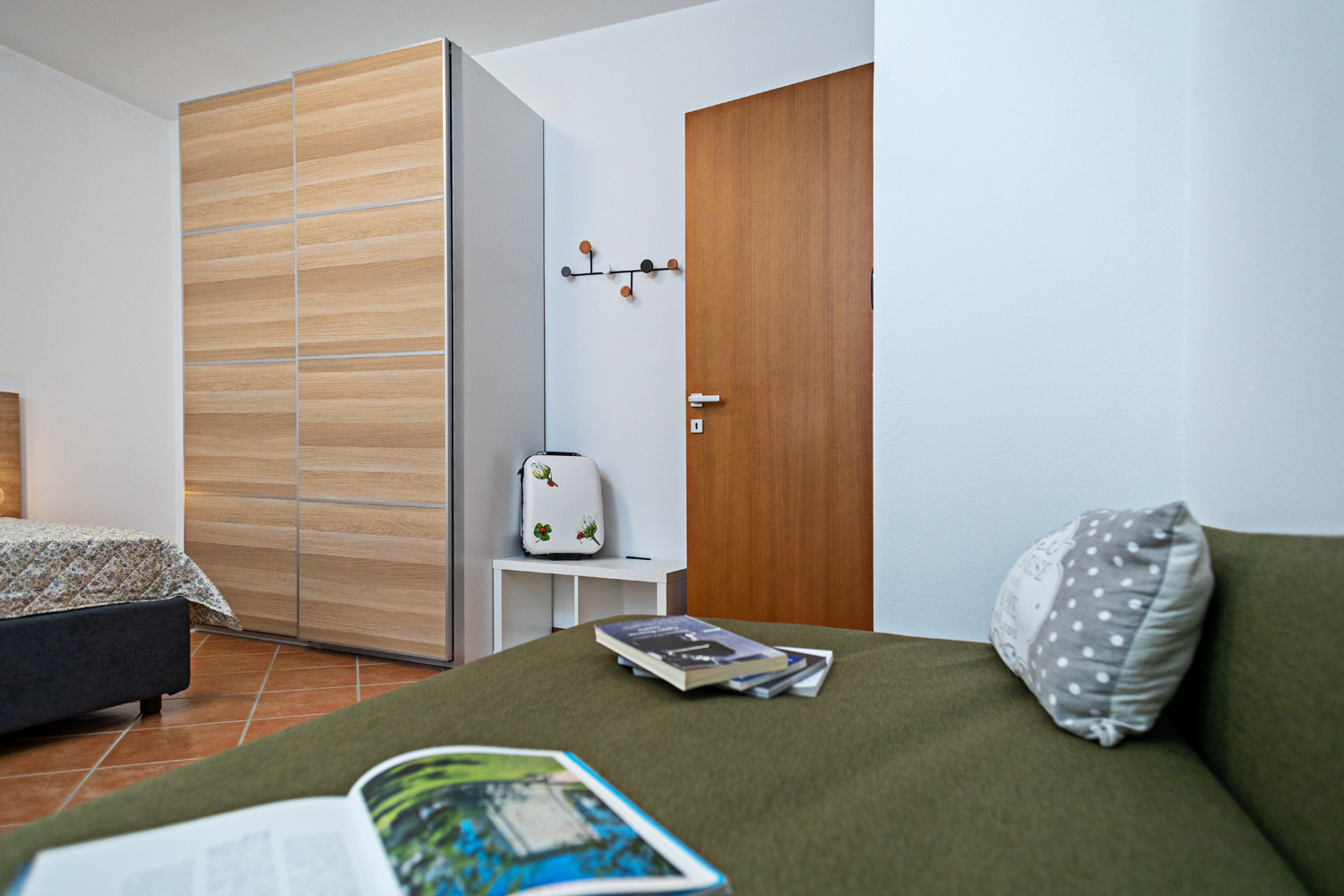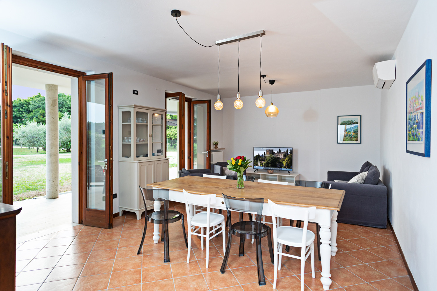 The Giarole apartment, entirely located on the ground floor, has a spacious room with two single beds that can be joined, a second room with a double bed and an additional single bed convertible to a double. Small bathroom with shower, main bathroom with window, shower box, double sink and laundry area. The spacious kitchen overlooks the side terrace equipped with table and chairs for pleasant outdoor meals; it features a modern kitchen with dishwasher, induction hob, microwave, large refrigerator with freezer, American-style breakfast counter, coffee corner with German coffee machine and coffee pod machine. The living area furnished with large dining table, sofa, armchairs and satellite TV, opens onto the covered terrace with lounge area and offers a pleasant view of the garden and swimming pool.