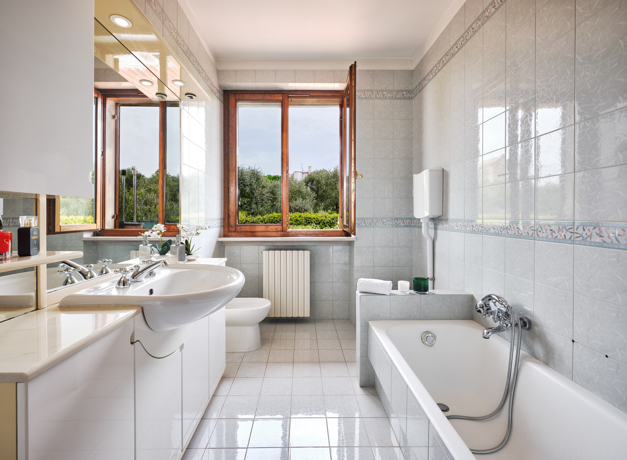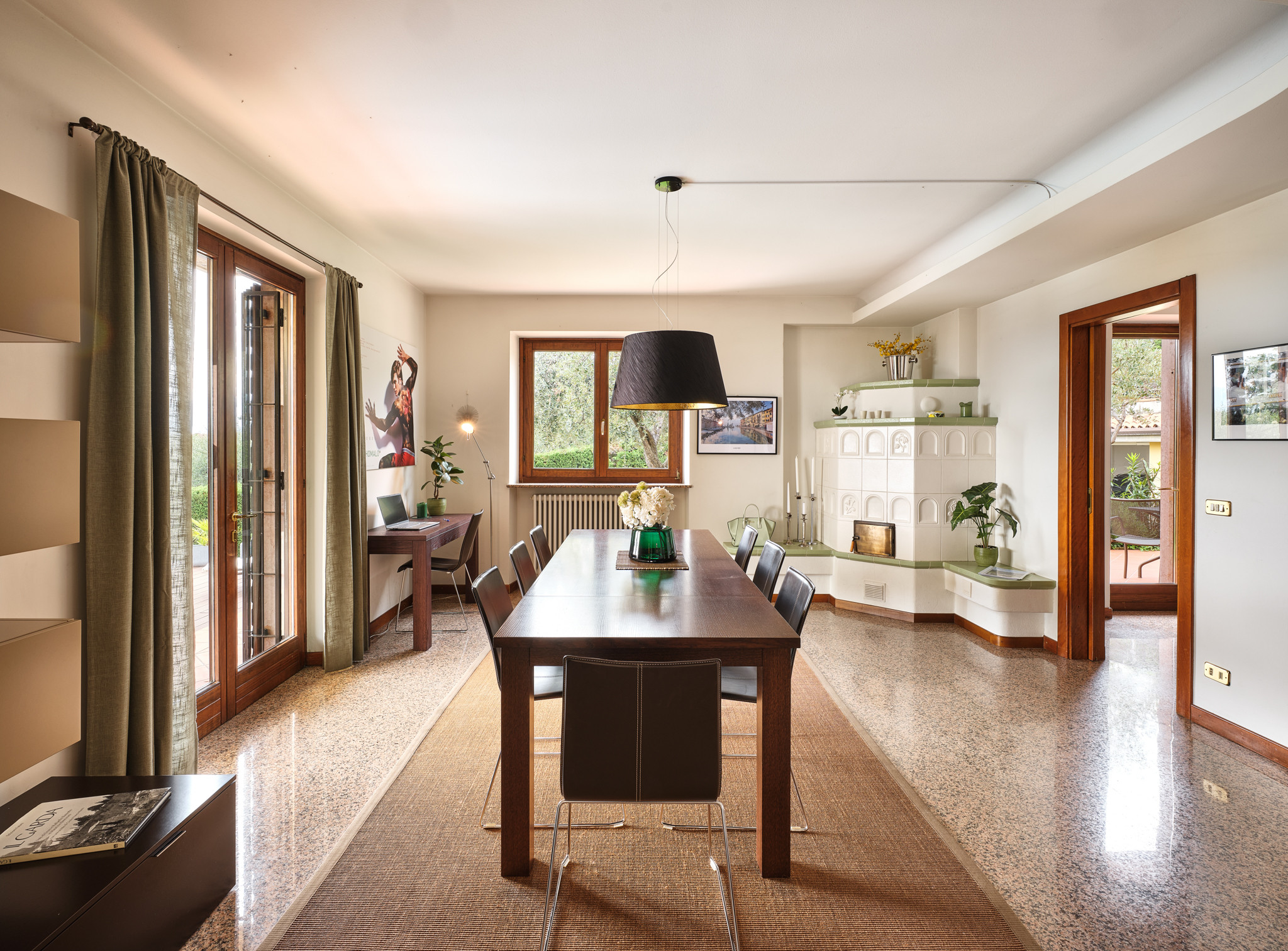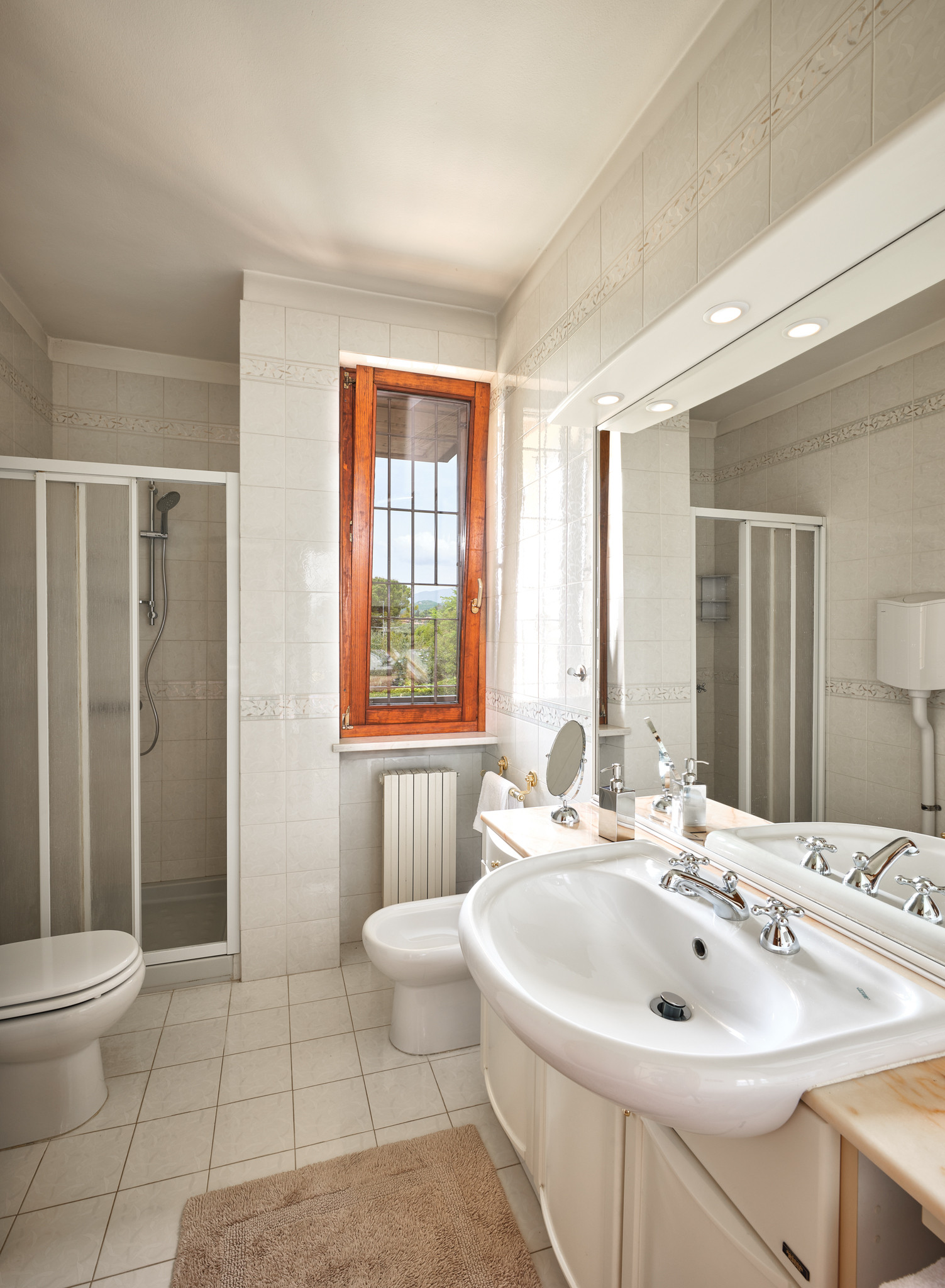 The 170 sqm villa is spread over two floors. The ground floor has a large living area with views of the pool and garden, with a majolica stove and TV (no satellite), separate equipped kitchen with refrigerator, gas hob, oven, dishwasher, toaster and coffee machine, pots and dishes. Luggage storage and shelter for electric bicycles available to guests. Service bathroom with shower and separate laundry room with washing machine.