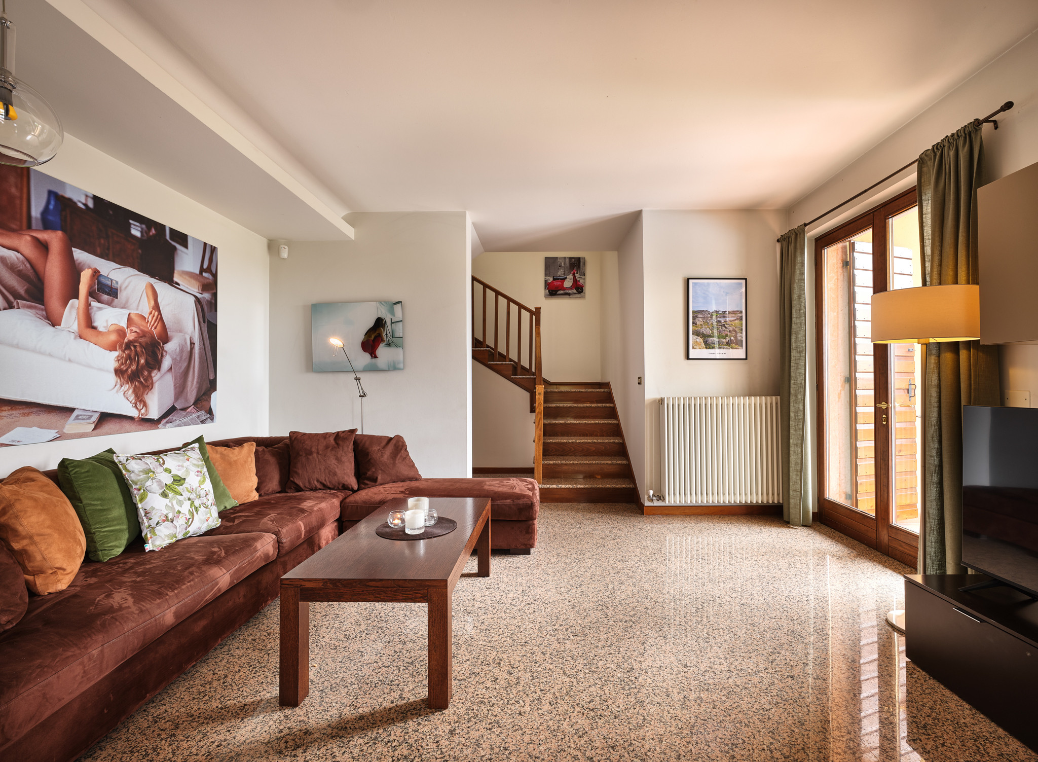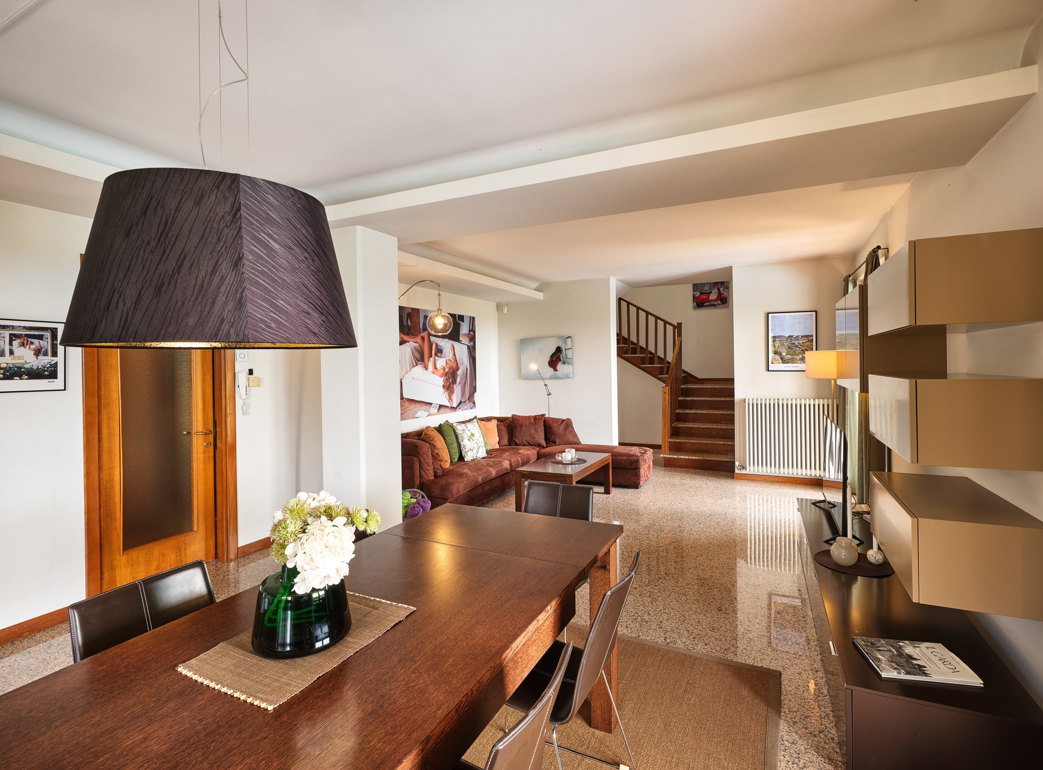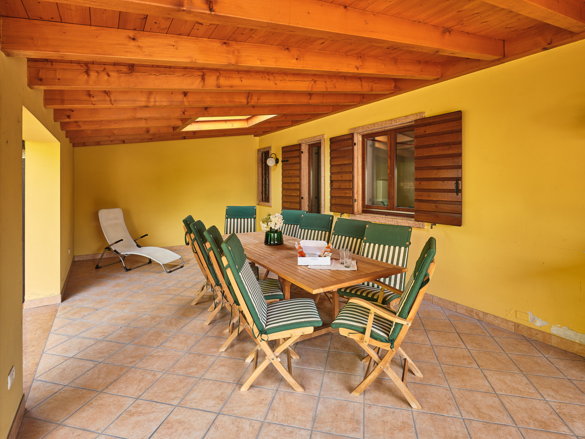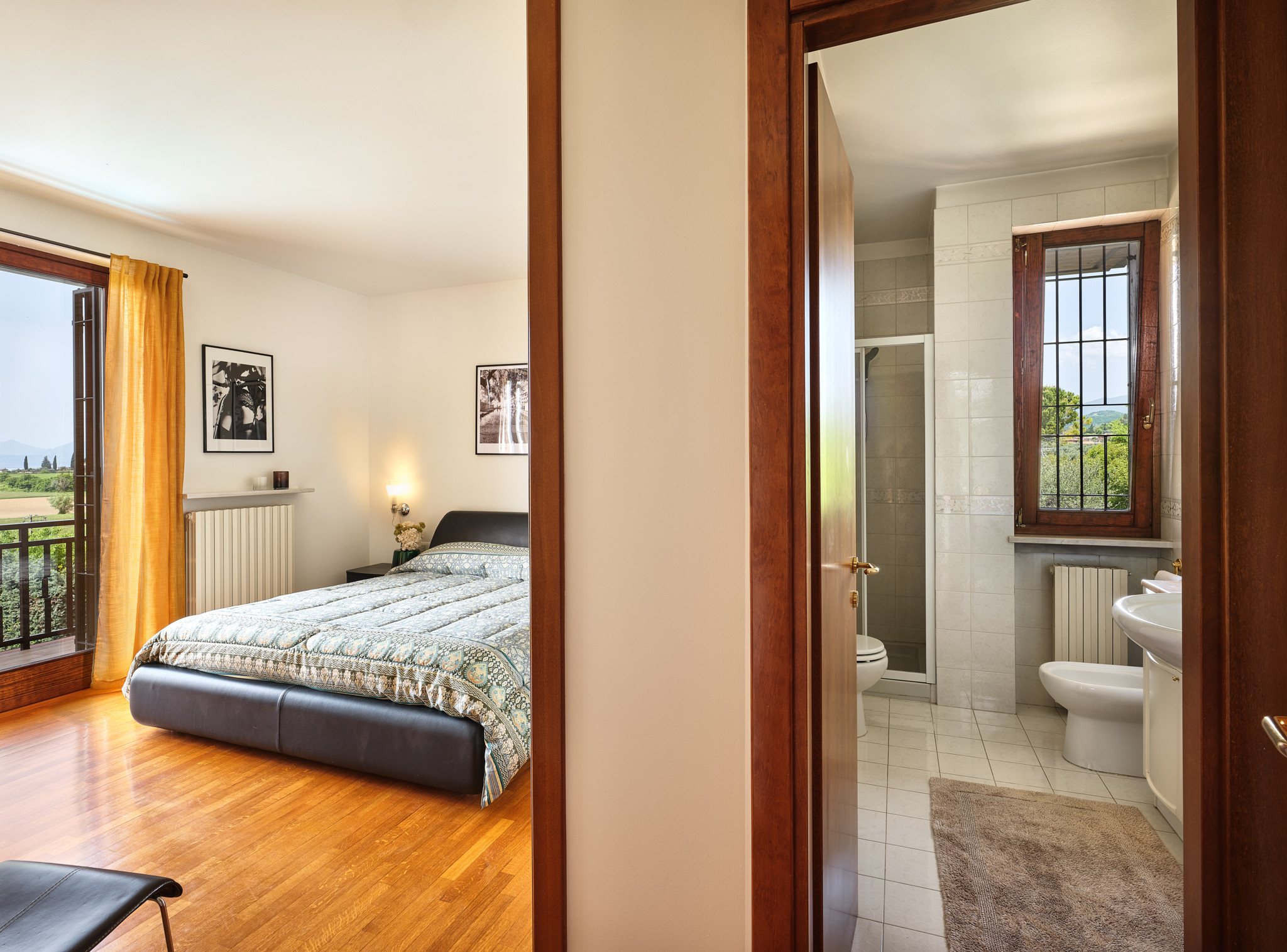 The 170 sqm villa is spread over two floors. The ground floor has a large living area with views of the pool and garden, with a majolica stove and TV (no satellite), separate equipped kitchen with refrigerator, gas hob, oven, dishwasher, toaster and coffee machine, pots and dishes. Luggage storage and shelter for electric bicycles available to guests. Service bathroom with shower and separate laundry room with washing machine.