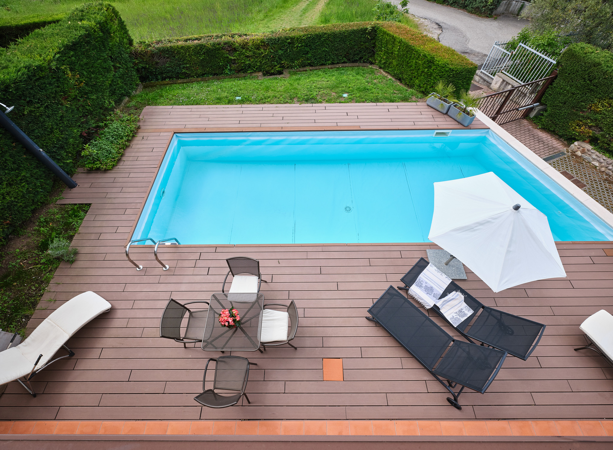 Large covered porch equipped with table and chairs. Private pool with solar shower and solarium. Outdoor lounge area with stunning lake view